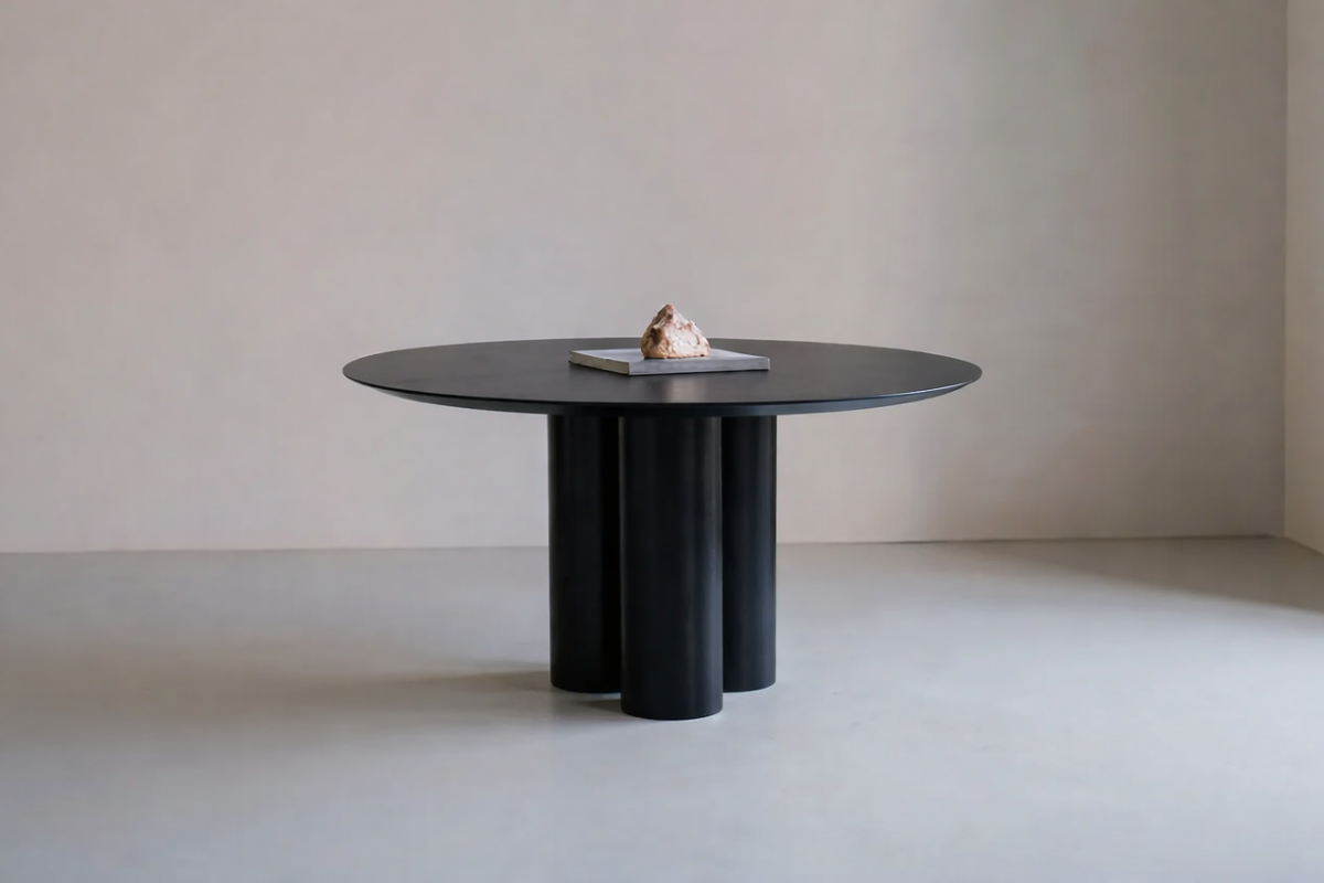 Minimalizmin gücünü yansıtan modern yemek masası. Heykelsi silindirik ayakları ve yuvarlak formuyla mekânlara zarif bir dokunuş katıyor.